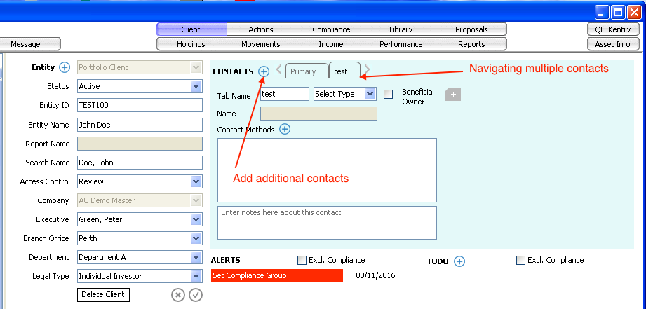 Once a new Entity is saved, the Contacts section will be activated.